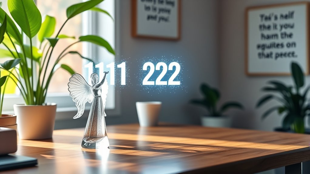 You should notice angel numbers as often as your frequency awareness and intuitive perception guide you. There’s no fixed rule, but staying attentive daily helps you catch their subtle messages. Trust your instincts to recognize when the signs feel significant. By practicing mindfulness and openness, you’ll naturally become more aware of these numbers, allowing them to guide your career choices more effectively. Regularly tuning in strengthens your connection with divine guidance.