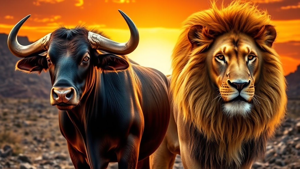 Ever wondered how Taurus and Leo pair up? Their connection is a vibrant dance of contrasting energies—Taurus’s steady sensuality meets Leo’s fiery pride. When you get to know these two signs, you realize that their romantic compatibility hinges on mutual admiration and shared passions. Taurus’s calm, grounded nature provides a stable foundation for Leo’s exuberance and flair for dramatic displays. These differences can either create sparks or cause friction, depending on how well they appreciate each other’s unique qualities. If you’re someone who values deep emotional bonds combined with excitement, this pairing can be quite fulfilling. Taurus brings a sensuality that’s tangible—an appreciation for the physical, the tactile, and the comfort of routine. Leo, on the other hand, thrives on recognition and admiration, often expressing their creative expression through bold gestures and lively passions. When they come together, it’s often a union where sensuality isn’t just physical but also emotional and artistic. Additionally, understanding astrological compatibility can offer deeper insights into how these two signs harmonize and grow together.
