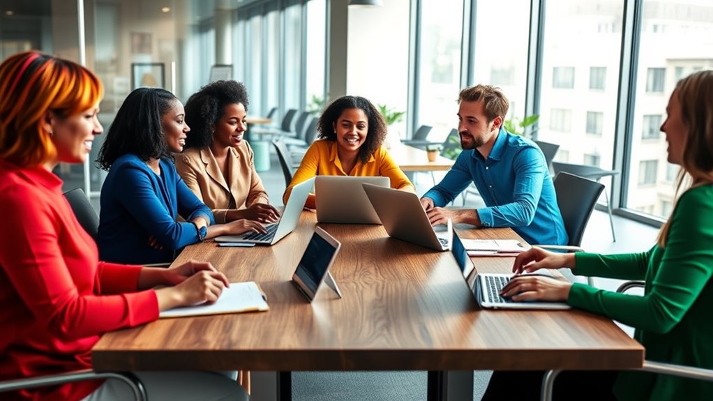Using color personality insights in team building helps you understand individual strengths and communication styles, making collaboration more effective. You can tailor leadership approaches, create balanced environments using color harmony, and design workspace layouts that suit different traits. This strategic approach fosters trust, boosts morale, and improves overall productivity. By applying these insights thoughtfully, you’ll develop a cohesive and dynamic team. Keep exploring how these strategies can transform your team dynamics even further.