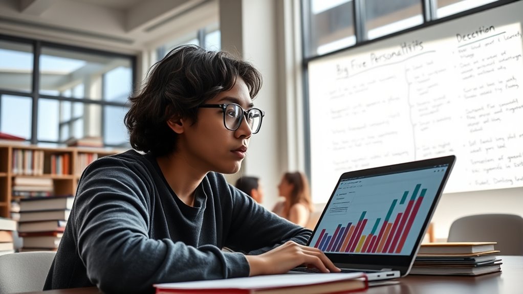 Your Big Five traits greatly influence your academic success. Conscientiousness helps you stay organized, disciplined, and goal-oriented, making it easier to stick to study routines. Openness fuels curiosity and creative learning methods, keeping you engaged. Extraversion supports collaborative work and discussions, boosting understanding. Neuroticism may cause anxiety that hampers your efforts, but managing stress improves routines. Agreeableness encourages teamwork and social support, enhancing motivation. Exploring how these traits shape your approach can reveal ways to strengthen your learning journey.