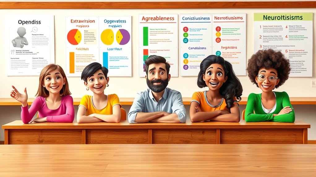 The Big Five personality traits are a widely accepted way to understand what makes each person unique. They include Openness to Experience, Conscientiousness, Extraversion, Agreeableness, and Neuroticism. These traits describe how you think, feel, and behave across different situations. High or low scores in each area influence your relationships, work, and personal growth. If you keep exploring, you’ll discover more about how these traits shape your everyday life and choices.