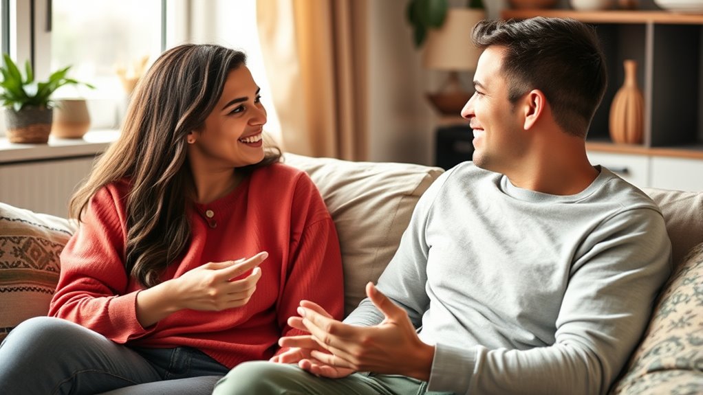 Nonverbal cues play a significant role in how you interpret what your partner is really saying. These cues include facial expressions, body language, gestures, and eye contact. For example, a smile or open posture can convey warmth and receptiveness, while crossed arms or avoiding eye contact might signal discomfort or disagreement. By tuning into these subtle signals, you gain insight into your partner’s feelings beyond their words. This awareness allows you to respond more thoughtfully, creating a safe space for honest communication. Recognizing nonverbal cues also helps you avoid misinterpretations, which can lead to unnecessary conflicts or feelings of disconnect. Additionally, understanding emotional intelligence can greatly improve your ability to connect with your partner on a deeper level.