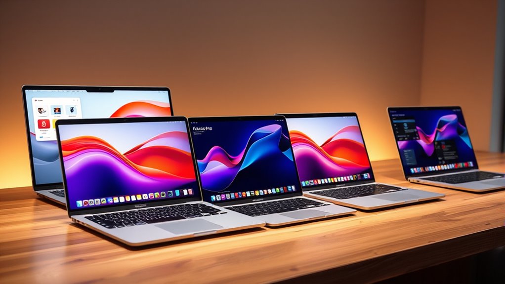 To get the most out of your MacBook Pro, it’s vital to evaluate how well it integrates with the Apple ecosystem. Seamless compatibility enhances productivity and makes switching between devices effortless. Features like iPhone Mirroring, Handoff, and Universal Clipboard rely on ecosystem integration, allowing smooth data sharing and continuity. The MacBook Pro’s connection with macOS ensures optimized performance with native Apple apps and services, maintaining a consistent user experience and security. Ecosystem compatibility also enables features like FaceTime, iMessage, and AirDrop, streamlining communication and file transfers exclusively among Apple devices. Using a MacBook Pro within this ecosystem guarantees synchronized updates for hardware and software, ensuring long-term compatibility, security, and access to the latest innovations across all your Apple devices.