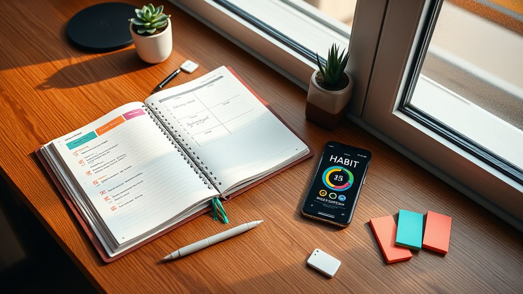 Choosing the right habit tracker can truly transform your self-improvement journey. I remember a friend who struggled with consistency until she started using a colorful wall calendar, and now she’s built lasting habits. Whether you prefer a sleek planner or a visual wall chart, picking the right tool makes all the difference. So, find what clicks for you, stay committed, and watch your progress unfold—your best self is just a habit away.