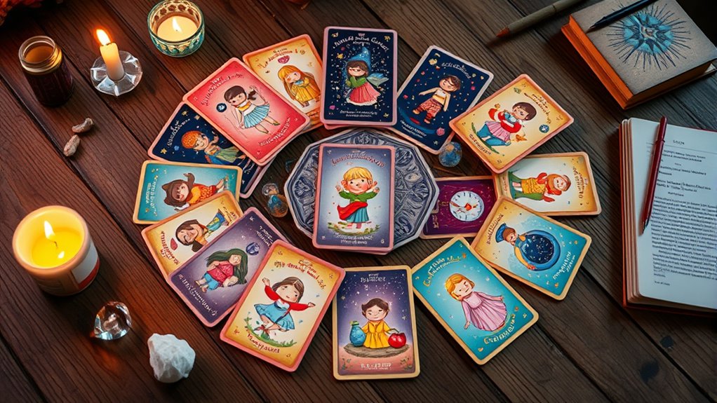 When selecting an inner child healing deck, it’s essential to clarify your goals to find the right fit. Are you seeking emotional release, greater self-awareness, or trauma resolution? Defining your intentions helps you choose a deck aligned with your needs. Consider whether you prefer decks with artistic imagery, practical prompts, or a blend of both—each supporting different approaches to inner child work. Think about your experience level too: some decks suit beginners, while others are better for more advanced users. Also, determine if you want tools for daily guidance, in-depth therapy, or group settings, as some decks are tailored for specific purposes. Ultimately, reflect on themes or messages that resonate with you, ensuring your engagement feels meaningful and supportive on your healing journey.