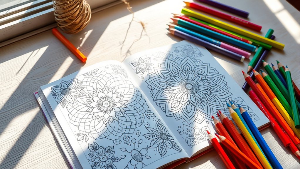 Think of your coloring materials as the brushes of your mindfulness journey. I recommend using high-quality colored pencils or fine-tipped markers—they allow for precision and smooth blending, making your experience more calming. Watercolor pencils are also a great choice for soft, flowing colors. Avoid cheap, scratchy supplies that can frustrate you. Choosing the right materials makes your coloring session more soothing and helps deepen your mindfulness practice.