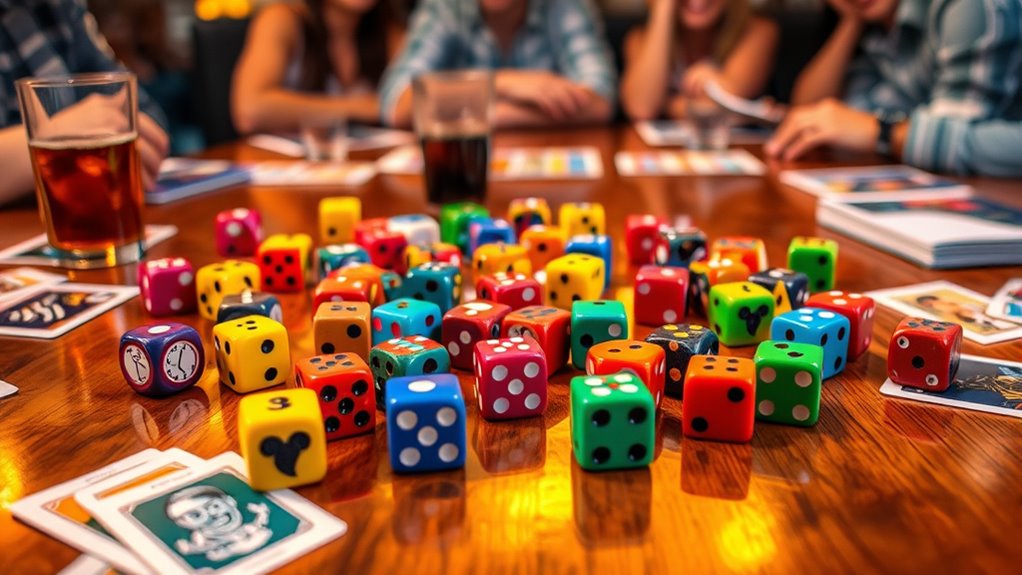 Evaluating the complexity level of personality dice games helps guarantee that the game matches the players’ experience and engagement preferences. Some games are simple, luck-based, and perfect for kids, featuring straightforward rules like choosing or re-rolling dice to reflect traits or themes. Others are more intricate, incorporating scoring systems, multiple rounds, or extra components like cards or tokens, which add strategic depth. The number of dice and faces per die also impacts difficulty; fewer dice and faces usually make learning and playing easier. Considering game complexity ensures it suits everyone’s skill level—whether you’re after casual fun or a challenging strategy game. Matching complexity to players keeps everyone engaged and maximizes enjoyment throughout the night.