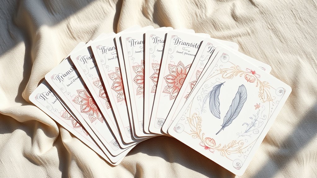 I believe that incorporating self-reflection cards can genuinely deepen your inner journey, much like the psychological theory that self-awareness boosts personal growth. These decks aren’t just tools—they’re catalysts for change, helping you explore your thoughts and feelings more openly. So, why not try one? You might find that, just like research suggests, taking time for reflection can lead to greater clarity, resilience, and a more fulfilling life.